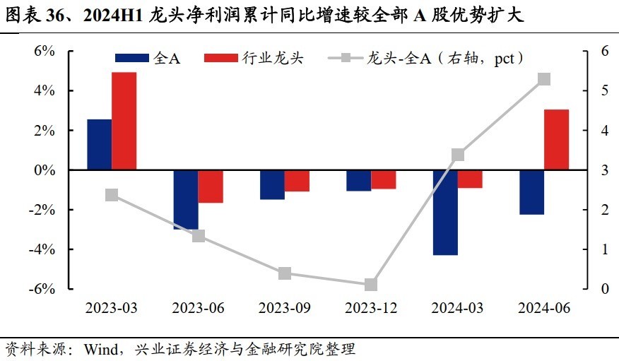 从数据来看,近几个季度A股上市公司中,龙头股的净利润同比增速明显高于全A平均水平,并且这一增速优势在过去几个季度呈现出逐步扩大的趋势。根据wind数据显示,2024上半年,龙头整体净利润增速为3.05%,增速高于全部A股5.29个百分点,领先幅度较2024Q1的3.38个百分点明显扩大。